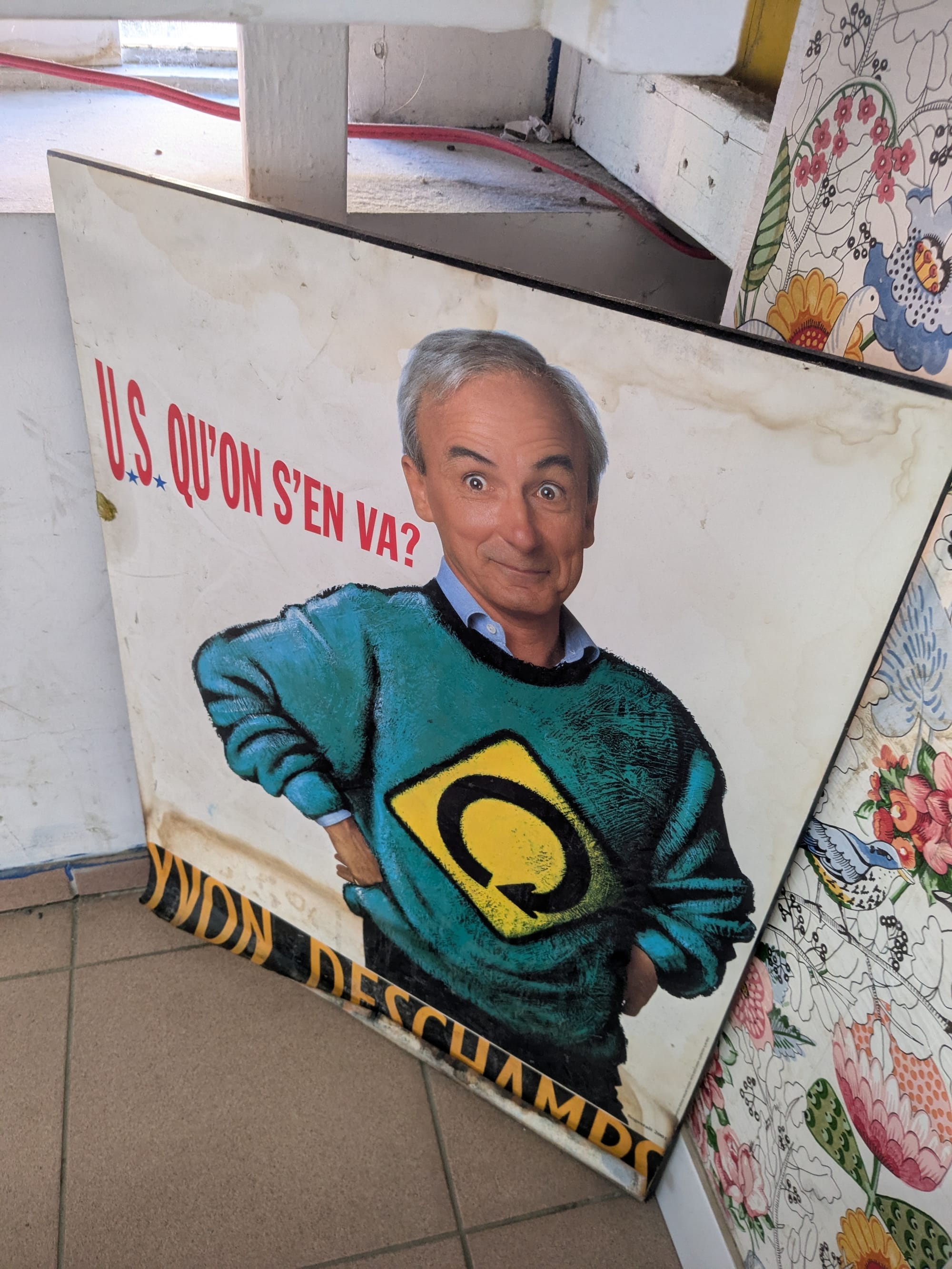 This fellow is Yvon Deschamps, an entertainer of legendary status in Quebec. I thought the French translated to something like 'U.S. Let's Go'. I don't know if he's saying Quebec should secede from Canada and join the U.S. or what. It's definitely an older poster and for all I know that was a real sentiment around here at some point. Certainly not a current one. From his expression I don't get the sense that he's serious, whatever he's trying to say. And after some scratching around it turns out the translation is actually 'What's Next for U.S.?'